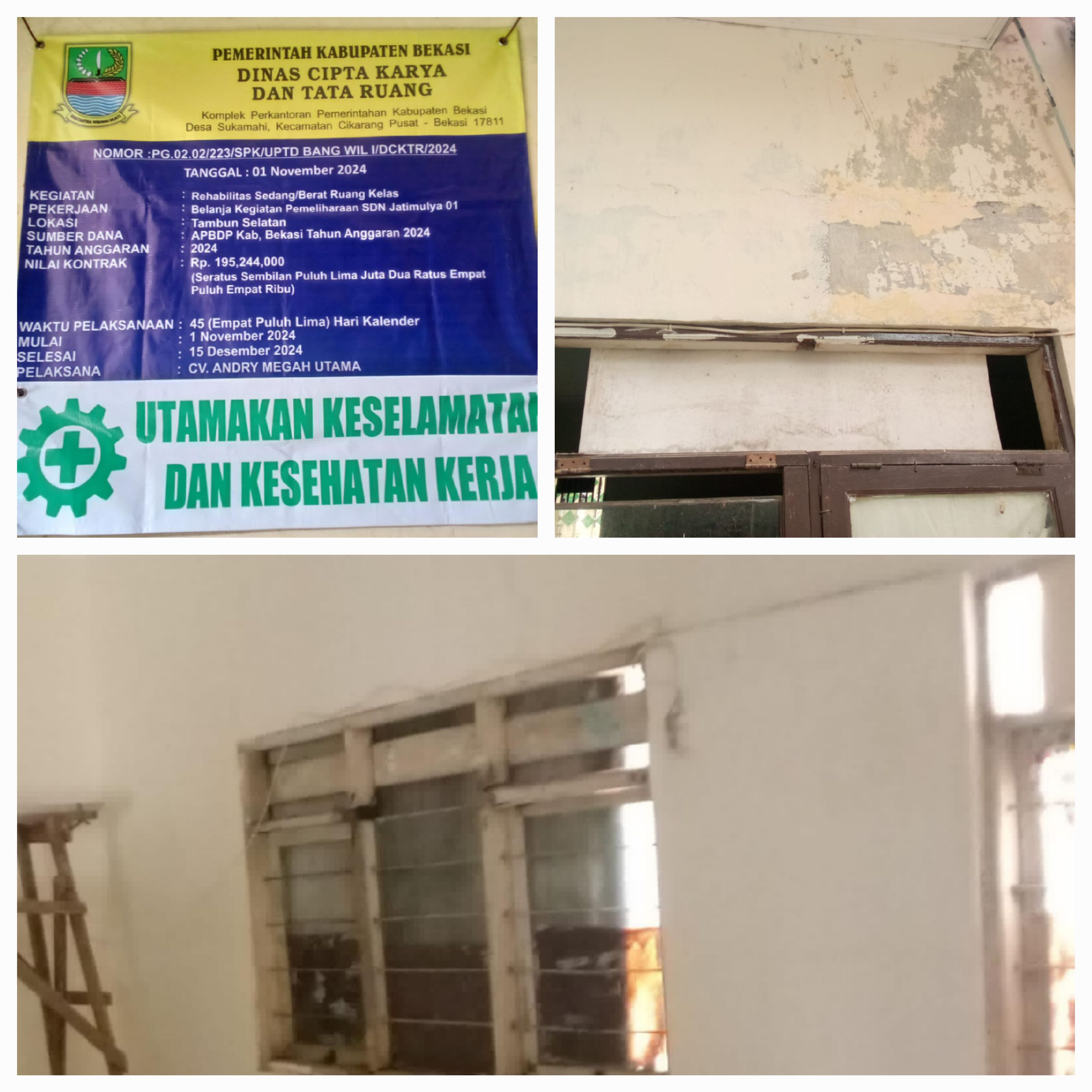 Berdasarkan Informasi papan proyek,dengan nomor :PG.02.02/223/SPK/UPTD BANG WIL I/DCKTR/2024,Kegiatan Rehabilitas Sedang/Berat Ruang Kelas SDN Jatimulya 01 APBDP 2024 Nilai Kontrak Rp.195.244.000 ,waktu pelaksanaan 45 hari kalender mulai pelaksanaan 1 November 2024 hingga 15 Desember 2024,Namun terlihat pekerjaan sudah selesai.