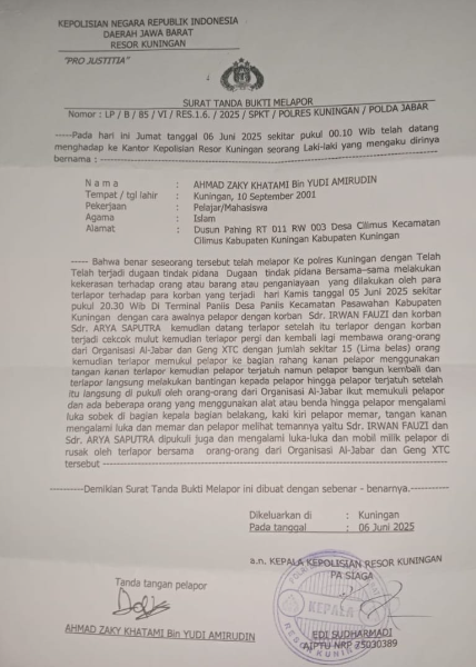 "Mereka mengaku dari ormas Al Jabar dan XTC (Exalt To Coitus) ormas otomotif Kuningan. Tanpa basa-basi kawanan mereka langsung melakukan tindakan pengeroyokan hingga Zaky babak belur. "Kata Irwan Fauzi (ketua Korwil FWJ Indonesia) Kuningan yang melihat kejadian dilokasi.