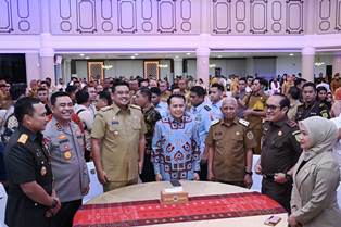 - Sejak pertama dilantik pada 20 Februari 2025, Gubernur Sumatera Utara (Sumut) Muhammad Bobby Afif Nasution baru secara perdana memasuki Kantor Gubernur, Senin (3/3/2025). Pada sambutan perdananya sebagai Gubernur, Ia menekankan tugas pemerintah adalah melayani masyarakat. “Kita ini semua adalah pelayan, dan tugasnya melayani, kalau masyarakat perlu minum, kita sebagai pemerintah harus menyiapkan, kalau masyarakat butuh makan, kita perlu memastikan pasokannya. Butuh keamanan dan kenyamanan, kita bertugas memastikannya,” kata Bobby Nasution, saat pisah sambut dan serah terima jabatan Gubernur dan Wakil Gubernur Sumut di Aula Raja Inal Siregar, Kantor Gubernur, Jalan Diponegoro 30, Medan.