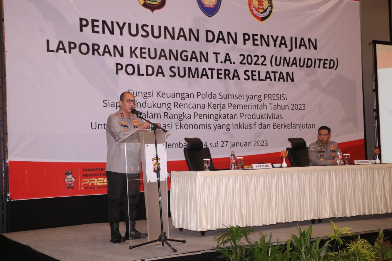 Kapolda Sumsel, Irjen Pol A Rachmad Wibowo SIK didampingi PJU Polda Sumsel membuka kegiatan penyusunan laporan keuangan Polri tahun 2022 (unaudited) Polda Sumsel, di Hotel santika Premiere Palembang, Selasa (24/1).