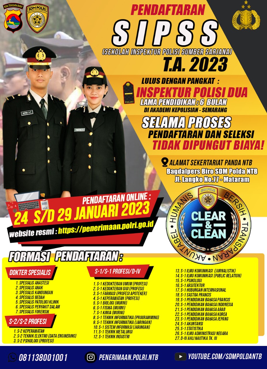 Kabid Humas Polda NTB, Kombes Pol Artanto, mengatakan bahwa pendaftaran SIPSS Polri dibuka mulai tanggal 24 Januari sampai dengan 29 Januari 2023 melalui laman penerimaan.polri.go.id serta melakukan verifikasi di Polda.