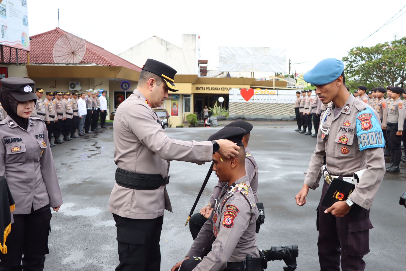Kapolres Sukabumi Kota, AKBP SY. Zainal Abidin menyematkan baret kepada Dua perwakilan Bintara Remaja pada upacara penutupan tradisi pembaretan Bintara Remaja Angkatan 48 di halaman Mapolres Sukabumi Kota, Selasa (28/2/2023) pagi.