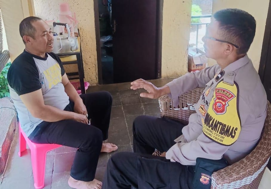 Anggota Bhabinkamtibmas Polsek Gunungpuyuh Resor Sukabumi Kota Aipda Arsyad menyambangi Yayan, Ketua RW 03 Kelurahan Gunungpuyuh Kota Sukabumi, Selasa (24/1/2023).