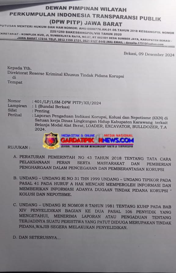 Lembaga Swadaya Masyarakat Perkumpulan Indonesia Tranparansi Publik (LSM PITP) Melaporkan Dinas Lingkungan Hidup Kabupaten Karawang Atas Dugaan Korupsi Belanja Modal Pengadaan Alat Berat,Loader, Excavator, Buldozer Tahun Anggaran 2024 dengan Nomor laporan 401/LP/LSM-DPW PITP/XII/2024. Dalam Uraian Laporan LSM PITP,Beberapa kegiatan tersebut yaitu Pangadaan Alat berat 3 unit , Pengadaan Kendaraan bermotor khusus roda tiga, Pengadaan Gerobak sampah,Indikasi dugaan korupsi Dinas LH kabupaten Karawang Memesan alat berat tersebut bermerek Cina manufaktur Liugong,Rekanan Dinas LH lebih mahal dari penyedia lainnya. "Perbandingan harga 500 juta satu unit .lebih mahal rekanan dinas LH dari pada beberapa pihak penyedia lainya yg di etalase e-katalog.dan setiap pembelian baru Alat berat sudah tertanggung perawatan minimal jangka waktu 1 Tahun dari Penyedia,alasan Pihak Dinas LH Tersebut tidak masuk akal,LSM PITP menduga ada mark-up harga satu unit alat berat yang di beli merk Cina manufaktur Liugong perbandingan harga 500 rupiah.