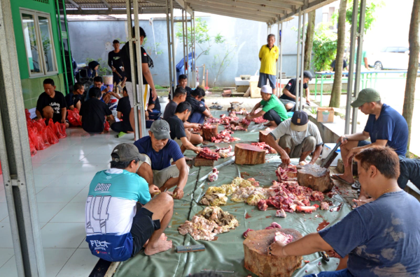 Subrek, Andi dan warga lainnya melaksanakan pemotongan hewan di halaman Mushola Khadijah Binti Khuwalid yang biasa mereka sebut Mushola KBK.