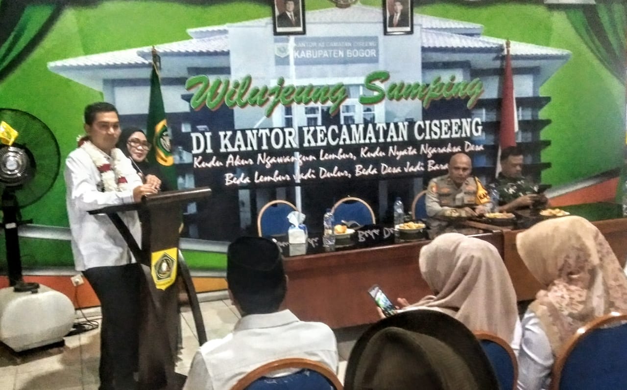 - Rabu, 9 April 2025 Pukul. 11.00 aparatur Pemerintah Kec. Ciseeng menyambut kedatangan Plt. Camat Adhi Nugraha S.Stp MH dan Ketua TP. PKK Hesty. Kedatangan orang No. 1 Kec. Parung dan kini menjabat sebagai Plt. Camat Ciseeng tersebut diiringi aparatur Kec. Parung, Kapolsek Parung Kompol Doddy Rosjadi SH MH, Danramil Kapt. Inf. Rahmat Saleh, Kepala Desa Waru Jaya Udin S/Oqiel, Ds. Cogreg Mad Yusuf Supriatna, Ds. Bojong Indah Satiri, Ds. Bojong Sempu Pitung, Ds. Iwul Nasim S, Ds. Jabon Mekar Ina Y, Kapuskes Parung dan Cogreg. Tampak hadir menyambut mereka selain Sekcam Ciseeng Ahmad Rosadi S.Ag, Kades Kuripan Siti Aswat Narulita, Kades Parigi Mekar Ade Syaprudin MM, Kades Cibentang Hasanudin, Kades Babakan Marwan Suherwan, Kades Cibeuteung Udik Bambang IG, Kades Ciseeng RBM, Kades Putat Nutug M. Darmawan, para Ketua Tp. PKK dan Sekdes se Kec. Ciseeng. Sekcam yang dalam kesempatan tersebut menjadi pembawa acara membuka kegiatan penyambutan Plt. Camat Ciseeng Adhi Nugraha S.Stp MH, memperkenalkan aparatur kecamatan dan kepala desa se Kec. Ciseeng yang hadir.